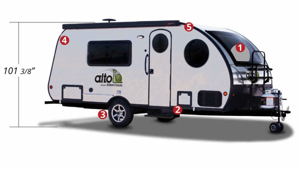 It has a seamless aluminum roof that is constructed from a single curved Alufiber/aluminium sandwich structure. Its spacious clearance offers easily accessible ample storage. A big private bathroom cabinet is included. The F model Alto can fit underneath an 8-foot garage door thanks to its external height of 95 inches (2.5 m). This innovative F series preserves its aerodynamic features and is readily towable by most compact cars or compact SUVs thanks to the streamlined design of the R-series roof. A lower buying price is associated with a simple construction.