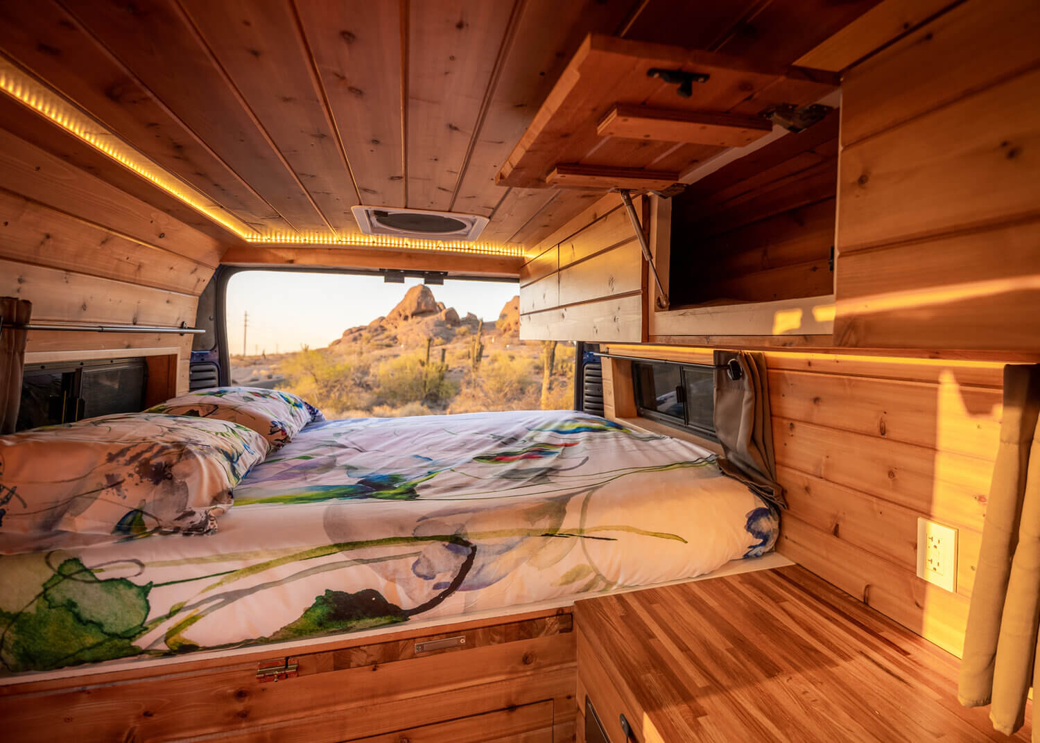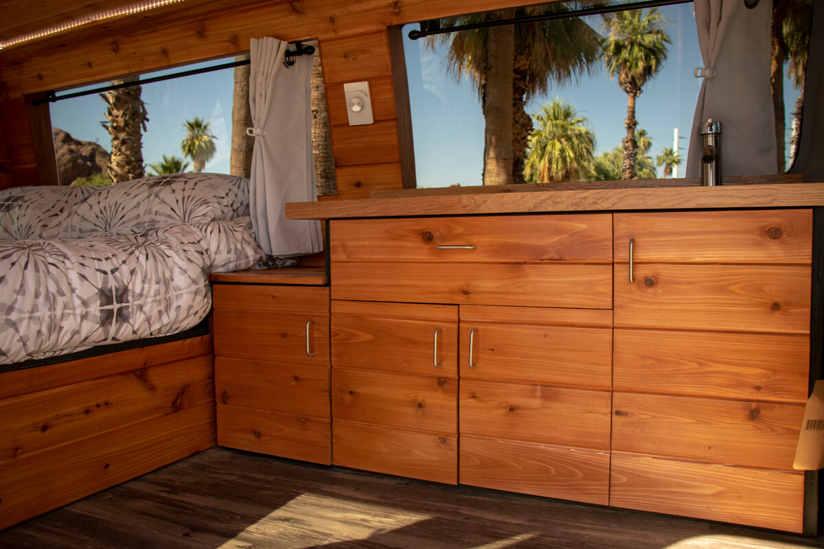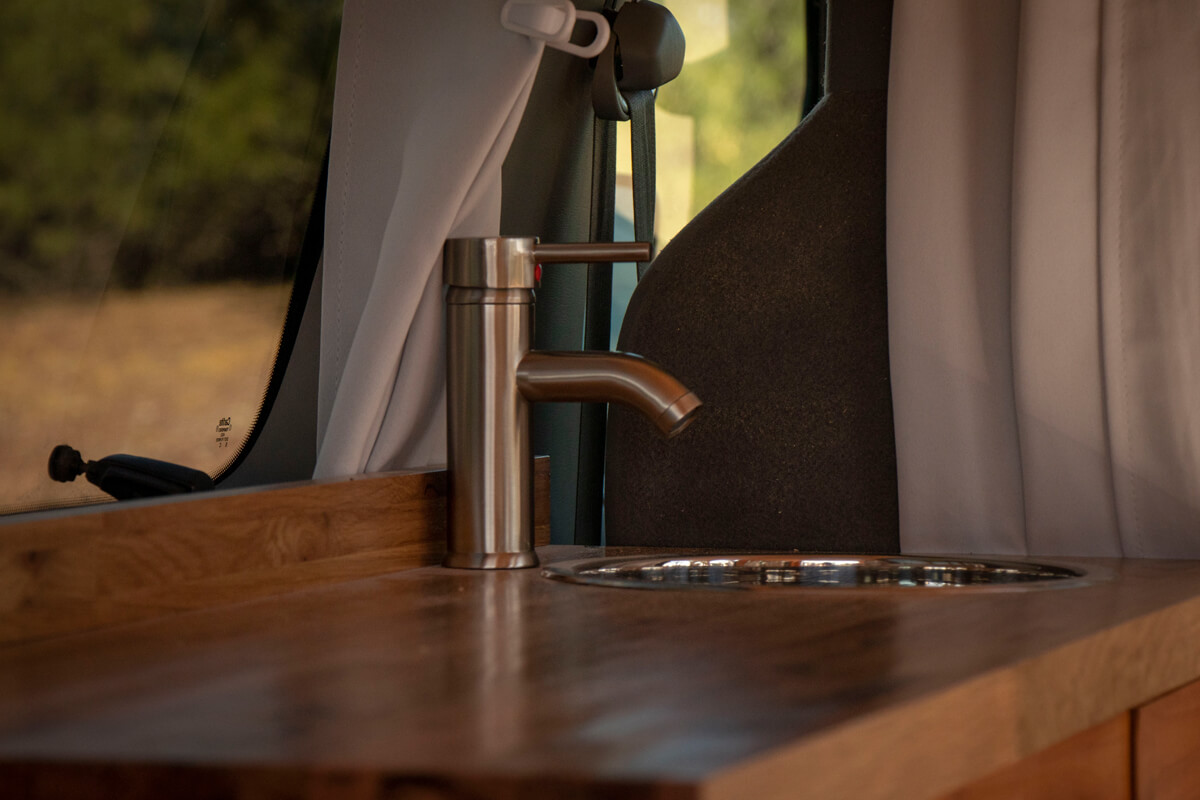 Boho includes a two-person full-size bed in the back, framing storage behind the mattresses. The long bamboo tabletop unit forward of the bed just on the driver’s side features an end sink with an electric pump and a 25-gal (95-L) water tank. The water tank also serves as a source of water for the outdoor shower.