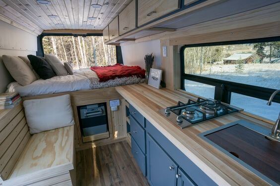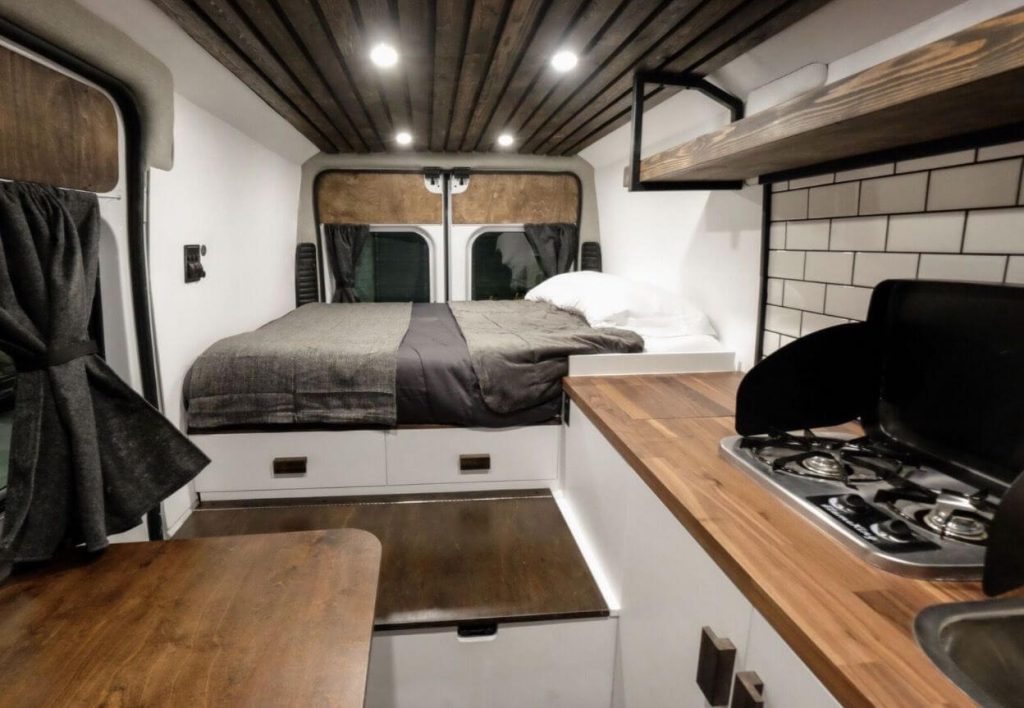 A complete campervan kitchen with a stainless-steel sink, 12-volt refrigerator, drawers, and cabinets is common among custom camper van manufacturers. There is also plenty of storage capacity.