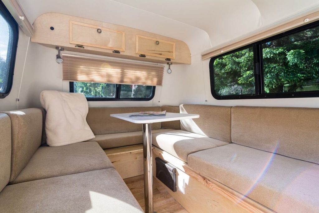 The camper’s inside is furnished with a dinette-style table that can be converted into such a full-sized bed that is for sleeping. The porta-potty is located under one of the benches, while the rest of the benches are available for storage.