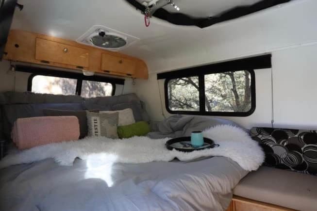 There are windows on all four sides of this camper trailer, and it is equipped with a Fantastic Fan to keep the air moving.